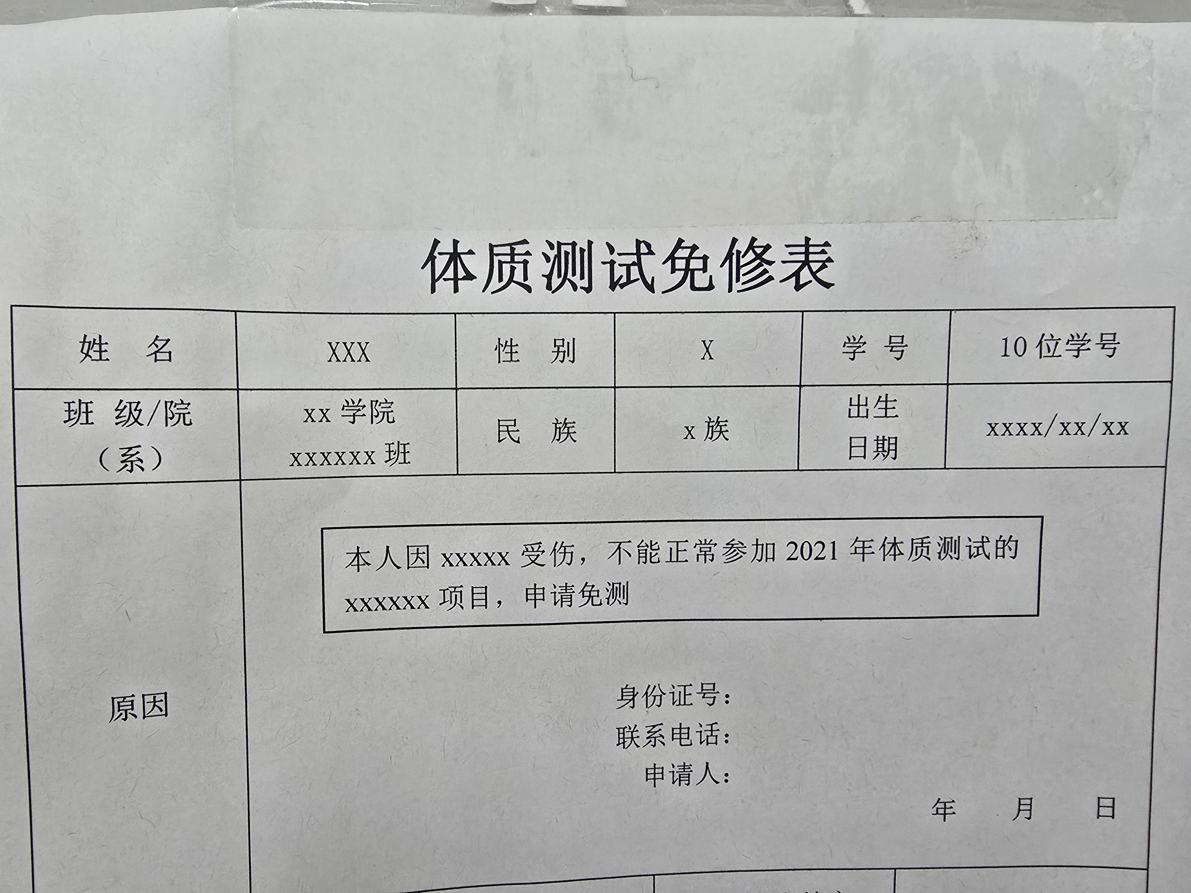 国家学生体质健康标准免测申请表