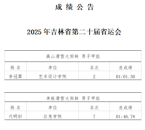 2025年吉林省第二十届省运会高山滑雪、单板滑雪成绩公告