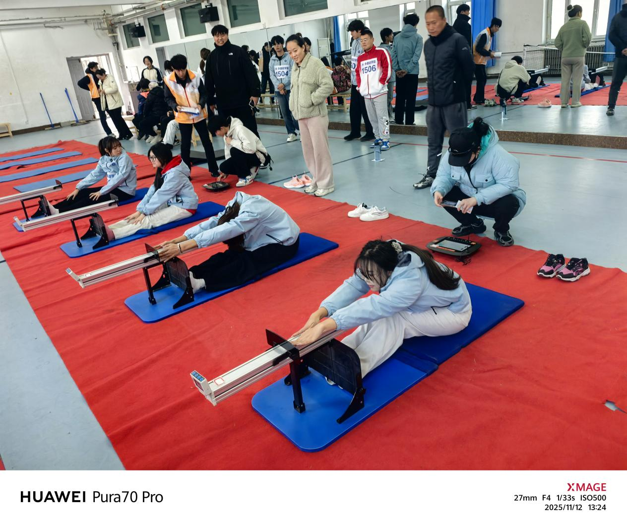赛场上,各学院队员迅速投入角逐,不同项目区域竞技热烈。50米跑道上选手全力冲刺;立定跳远场地运动员动作凝聚力量;引体向上架下男生发力引喝彩;仰卧起坐区域女生匀速起落展毅力;肺活量与坐位体前屈测试区选手也全力以赴。裁判员严格记录成绩,校医院医疗点随时待命。